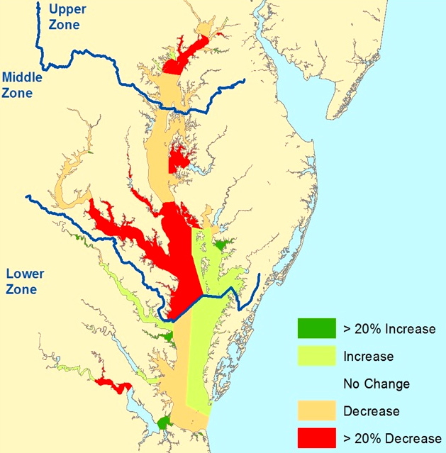 In the middle Bay zone (from the Chesapeake Bay Bridge to the Potomac River and Pocomoke Sound), bay-grass acreage decreased 11 percent to 35,446 acres—31 percent of the 115,229-acre goal. Most areas declined in this zone, with the largest percentage declines occurring in the middle and lower Central Chesapeake Bay, as well as the Choptank, Honga, Patuxent, and Potomac Rivers. Increases in bay grasses were seen in Tangier and Pocomoke Sounds and the Manokin and Big Annemessex Rivers, as eelgrass continued its resurgence following a 2005 die-off.