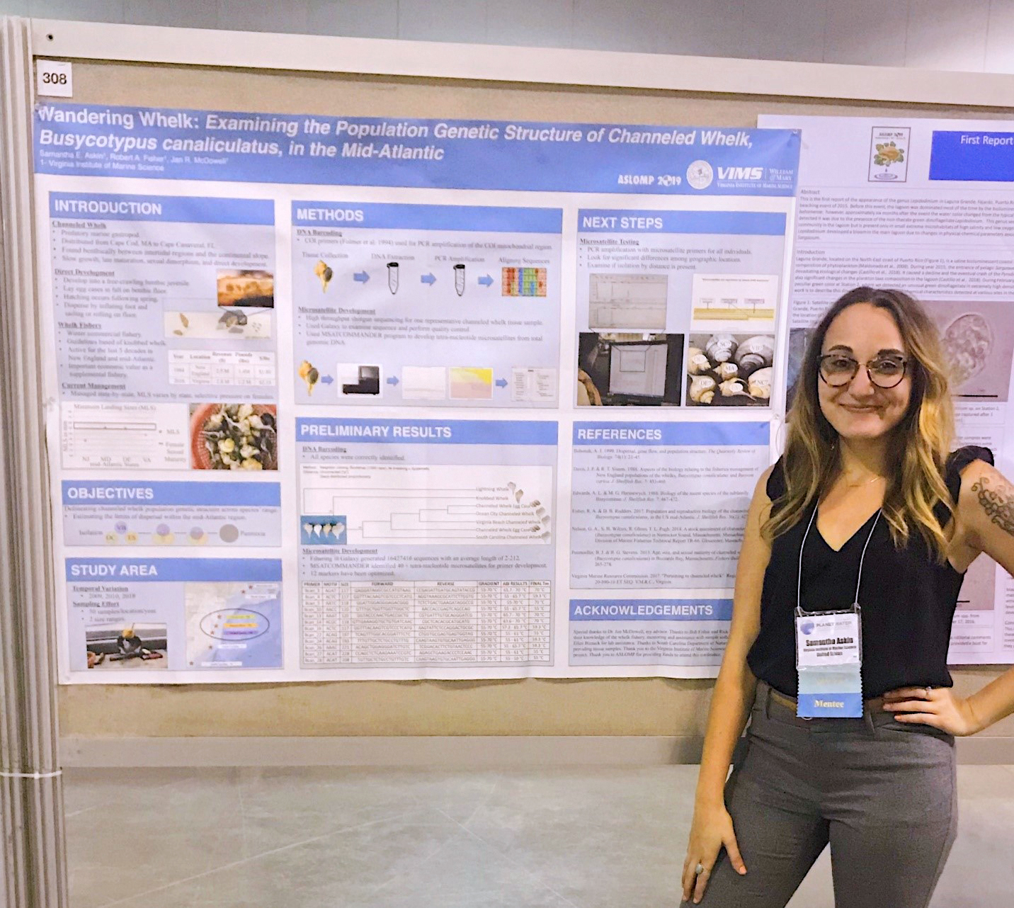 I am a Master's student in the McDowell lab at VIMS. My current research topics include population genetics and fisheries management for channeled whelk, Busycotypus canaliculatus, a marine snail native to the east coast of the United States. My project is using genetic tools to help provide information to fisheries management agencies, so that channeled whelk can be properly managed for sustainable fishing. This will allow for continued economic success of this commercially important species. I am also part of an education assistantship at VIMS that provides me with the opportunity to do marine science outreach to various groups in the community. In my free time I like to go birding and search for herpetofauna at Newport News Park.