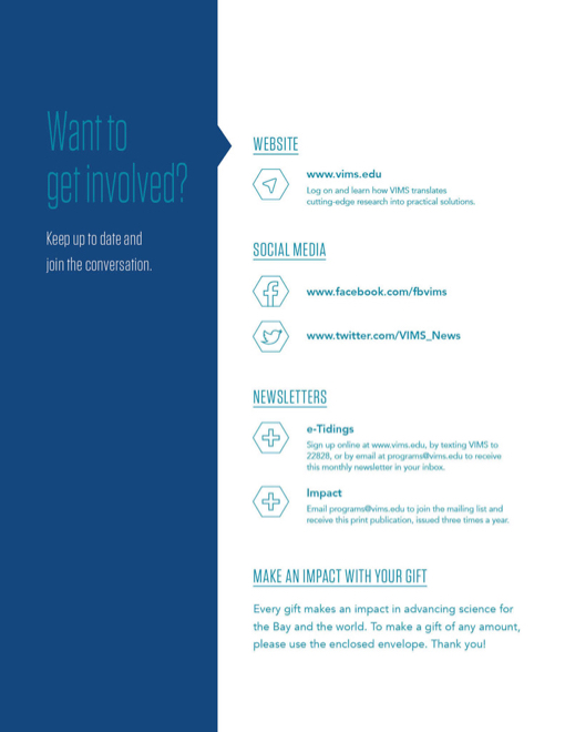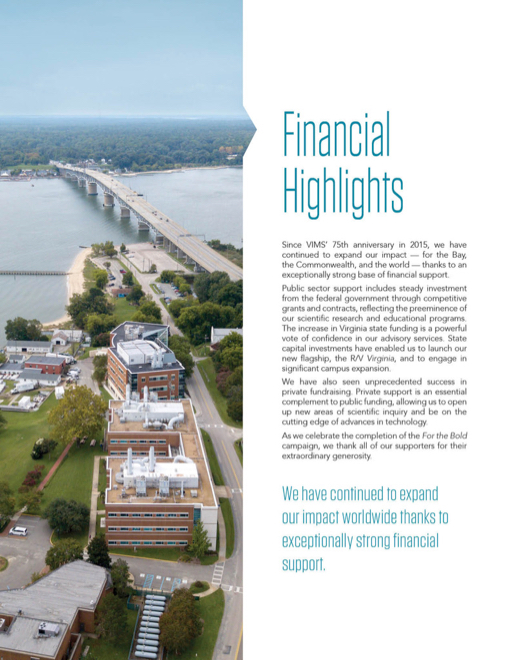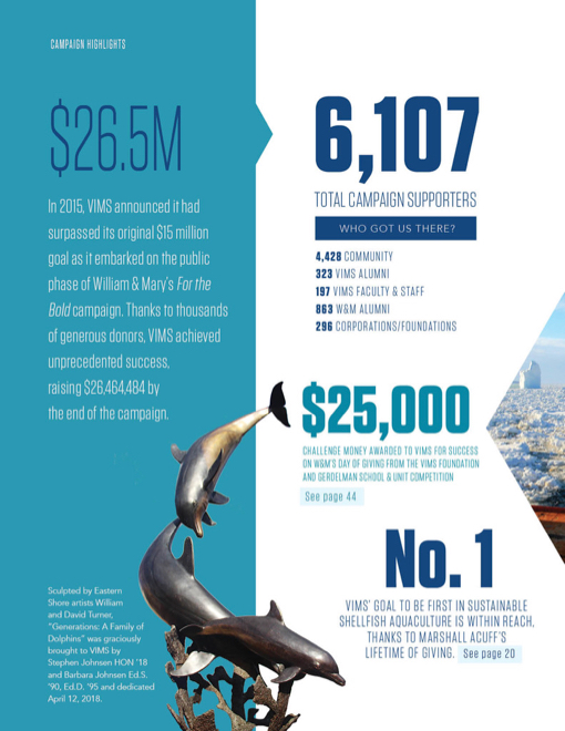 In 2015–our 75th anniversary–VIMS established a 5-year strategic plan with 6 ambitious goals. In the 2015-2020 Impact Report, VIMS is proud to highlight the institute’s achievements.