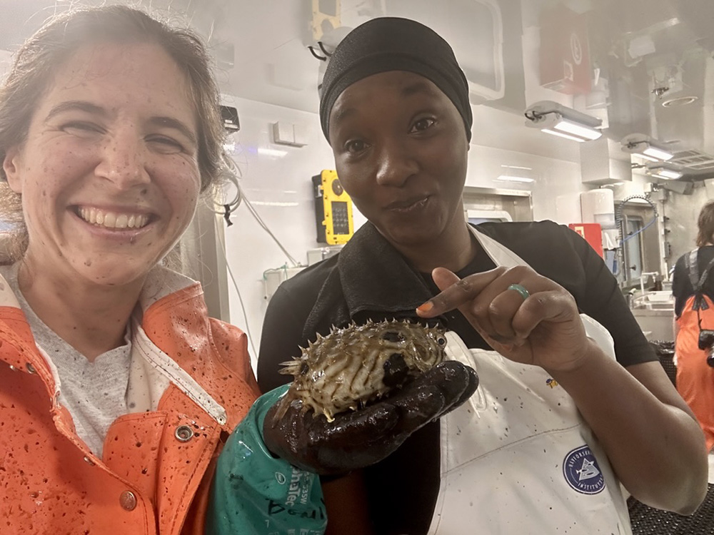 Kate Bemis excited about a burrfish caught off west Africa in March, 2025, with Khoudia Khaya, Senegal. Photo credit: Katherine Bemis.“One of my favorite parts about this job is the international collaboration,” she said. "In order to understand the fishes that occur in US waters, we have to understand global occurrences of the same or similar fishes to have the full picture of their evolutionary history and identification... I've been fortunate since I started this role to do a lot of international research.”