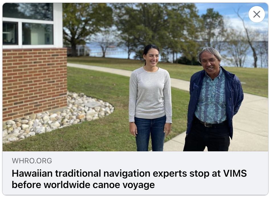 Nainoa Thompson, Director of the Polynesian Voyaging Society (PVS), is serving as the inaugural Scholar in Ocean Residency at William & Mary's Virginia Institute of Marine Science. We are honored to partner with Nainoa as he and PVS colleagues help amplify the voice of Chesapeake Bay tribes and launch canoe voyages designed to build links between indigenous communities worldwide.