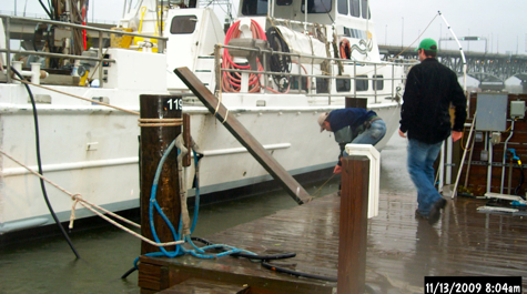 Flood waters in the VIMS Boat Basin raise the R/V Bay Eagle above the level of the bulkhead. 8:04 am on Thursday, November 12, 2009.