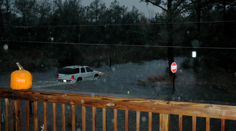 A vehicle navigates a flooded road in Hayes, Virginia.