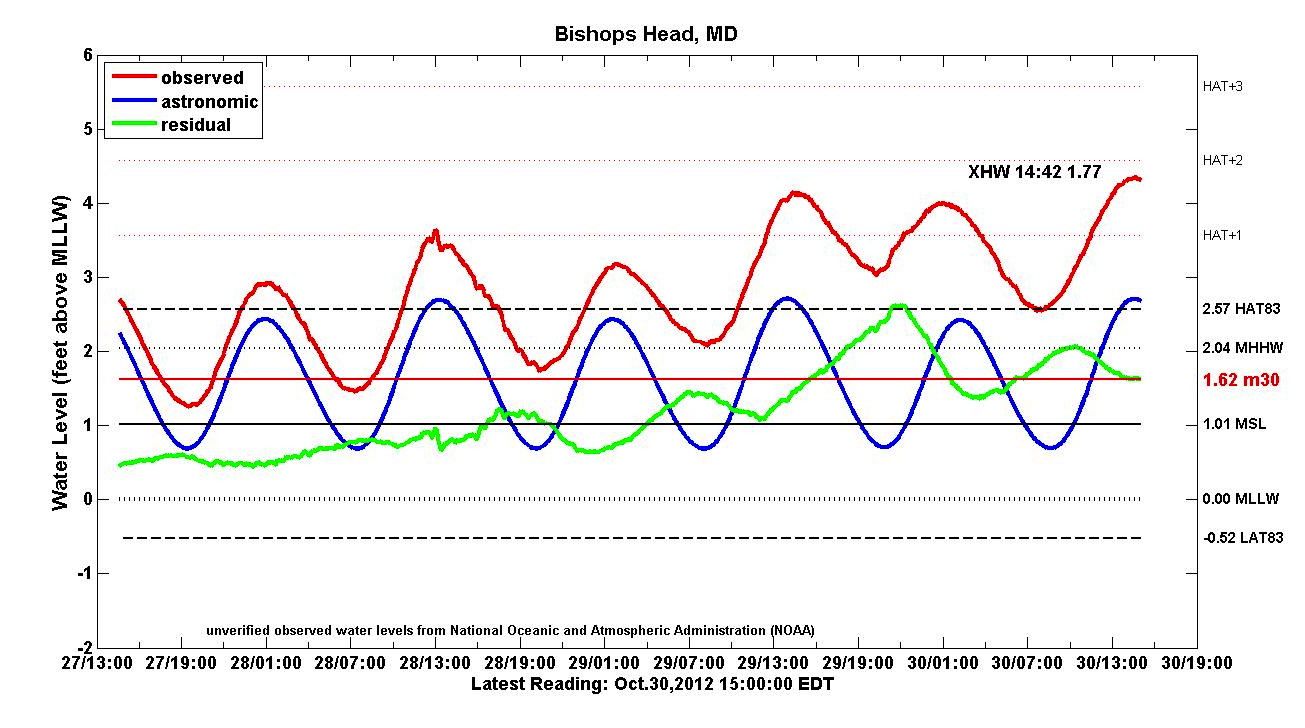 The 3-day Tidewatch record for Bishops Head, Maryland during the passage of "Superstorm Sandy."