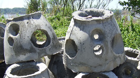 Various manufactured products can be used to create an artificial reef foundation that supports the settlement and growth of shellfish. Individual units are typically placed close together similar to a stacked shell bag or marsh sill structure.
