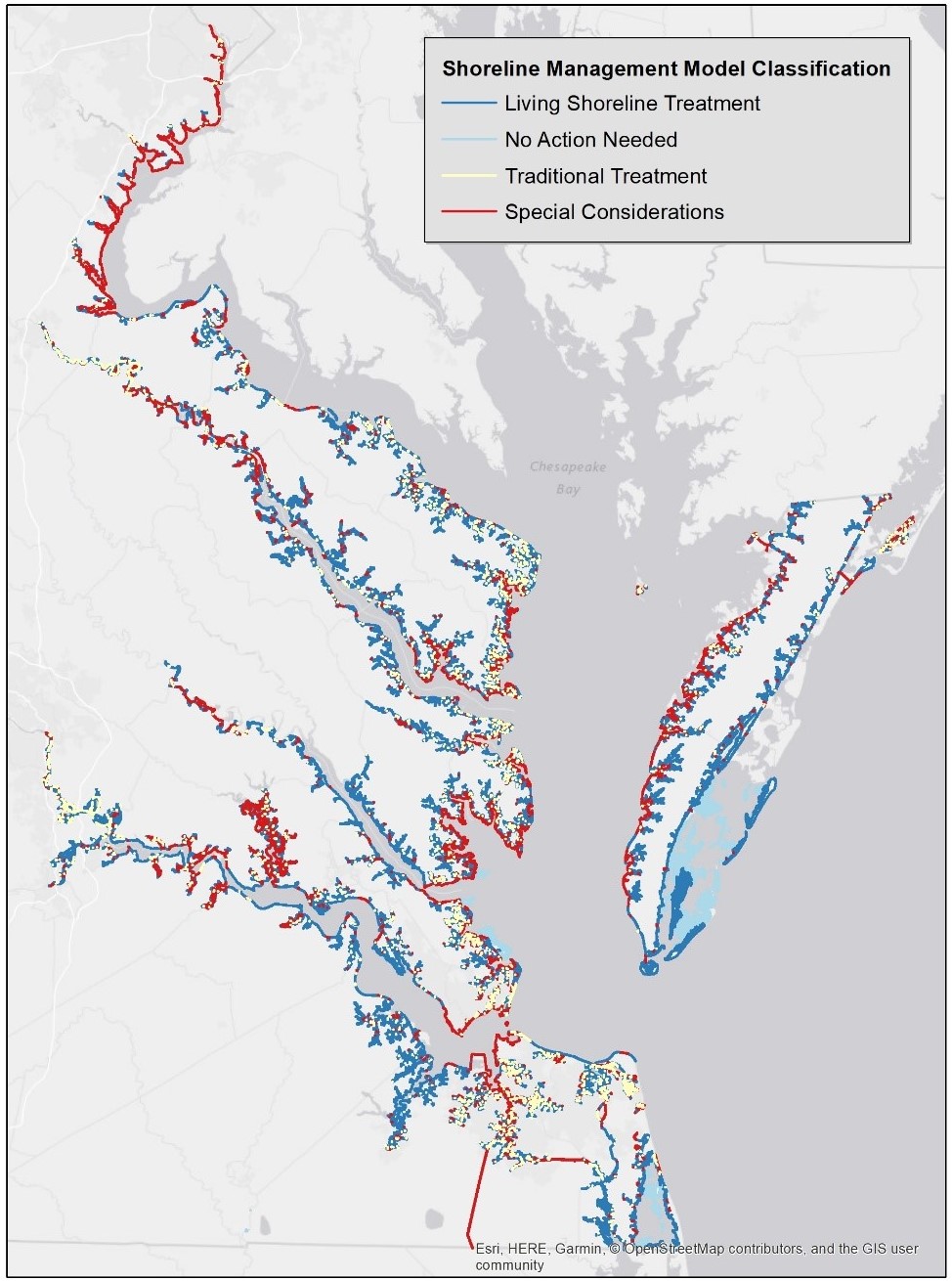 Notes: This map presents both currently defended and undefended shorelines that are suitable for a living shoreline (planted marsh with or without a sill structure depending on wave energy conditions).