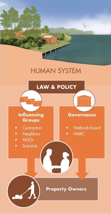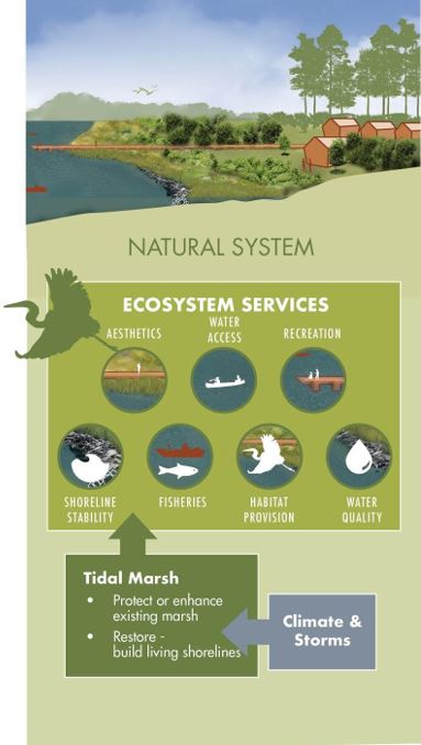 Revised policies, in concert with enhanced communication by influencing groups to property owners on the societal value of ecosystem services provided by marshes and living shorelines, will likely result in more sustainable shorelines and coastal communities under a changing climate.