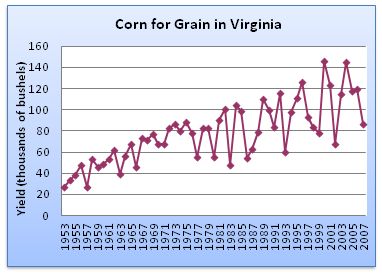The GDD varies over time and from year to year, but there are no obvious trends in the data. Because of the way this index is calculated, results will differ depending on the starting and ending dates used for the calculations. The graph below shows corn yield for the state of Virginia obviously trending upwards overtime. Although this may be in part due to climatic influence, it is also impacted by increased harvest efficiencies, new corn hybrids, changes in demand for corn and other non-climate related factors.