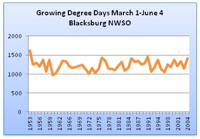 A similar index can be used to calculate growing/living/breeding conditions for plants and insects. This type of index is frequently used for agricultural practices to see if plants are growing on schedule. This allows farmers to predict harvest dates, determine which plant strains or hybrids to plant, and assess the likelihood that other factors (such as lack of fertilizer) are contributing to poor plant growth. When used for agriculture, the index is known as Growing Degree Days (or GDD) and it indicates the number of days in the growing envelope for plant development. Below is a graph showing GDD for corn growth in Blacksburg, VA over a 50 year time period. Click here for more information on calculating and using GDD for corn agriculture.