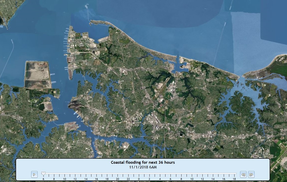 Modeling for tidal flooding can often be estimated using a simplified topographic bathtub model using GIS, whereas storm-driven flooding may include complex storm surges, and rainfall, and derivative river discharges which necessitate the use of more complex physics-based models such as VIMS’ street-level inundation model or SCHISM to properly conserve fluid mass and momentum to most thoroughly estimate the timing, extents, and depths of anticipated flood impacts. These models have contributed to the long-standing record of expertise the Center for Coastal Resources Management (CCRM) has exemplified in flood-related advisory services through their development the Adapt VA portal, CCRMPs, and VFRIS in service to the Commonwealth since the CCRM’s inception in 1992.