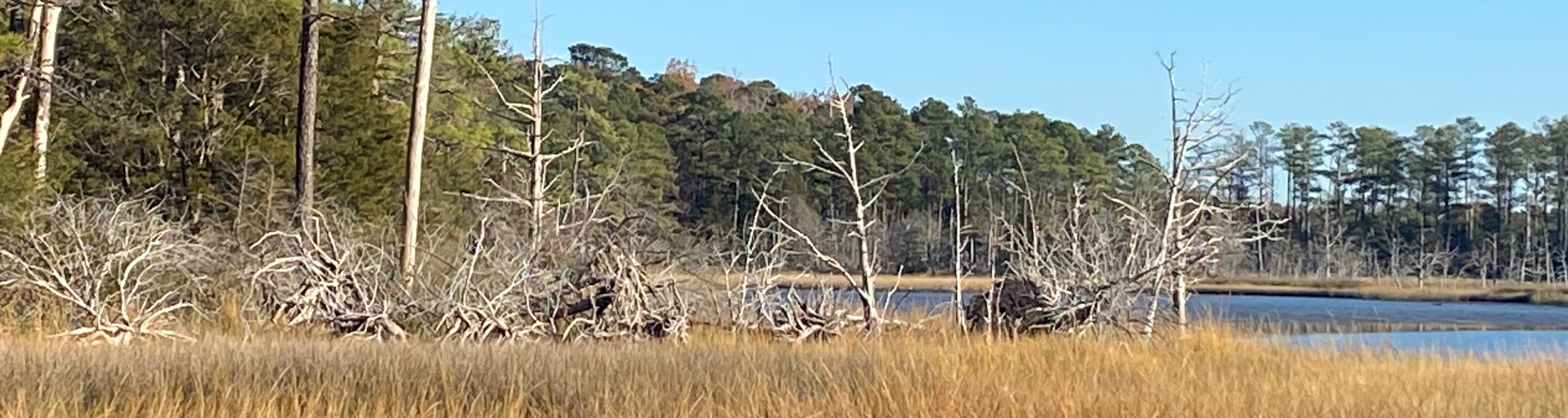 Dead trees near the water can be a sign of high-salt levels in the soil.  As the trees die, more salt-tolerant shrubs and grasses move in to take their place.  These “wooden tombstones” and/or "ghost forests" are already a problem all along the East Coast and Gulf Coast.  Coastal woodlands like these are critical ecosystems, as they filter pollutants, act as natural barriers and store carbon in the ground.