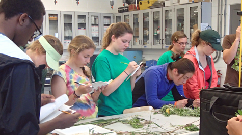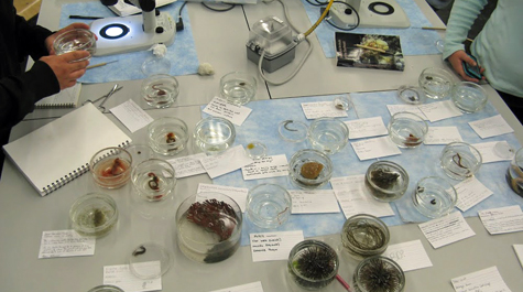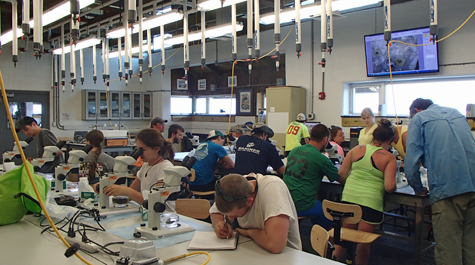 Visiting students use microscopes and taxonomy guides to identify a variety of marine species found in the waters near the Eastern Shore Laboratory.