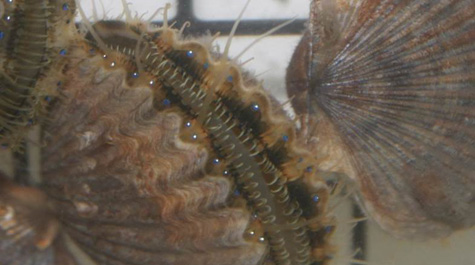 VIMS ESL’s bay scallop production uses methods initially developed by Mike Castagna and ESL staff in the 1960s and ‘70s, and by Mike Oesterling at ESL in the 1990s. Aquaculture staff at ESL continues to improve upon the efficiency of hatchery and nursery culture of the bay scallop. Adult broodstock are spawned in the Spring and the Fall each year at ESL’s Castagna Shellfish Research Hatchery. The larvae produced from these spawns are reared in the hatchery and fed cultured microalgae before being transferred to the land-based nursery where they set, grow, and feed on phytoplankton naturally occurring in the Wachapreague Channel. Upon reaching a shell height of >3 millimeters, these individuals are either deployed in cages to grow and spawn in the restored seagrass beds, released in the grassbeds, or distributed to commercial growers for testing. While the scallops are held in ESL’s cages in relatively high densities, it is the hope that they are spawning and producing millions of larvae that will colonize the grassbeds. In more recent years, “spawning cages” have been temporarily relocated to other coastal bays in order to encourage a wider distribution of larval production during the scallops’ natural spawning season.