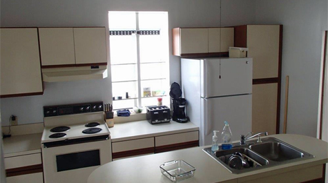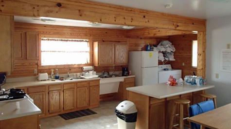 Each building has a full service kitchen with dining area. Standard appliances and cookware are available, but all food must be brought by guests.