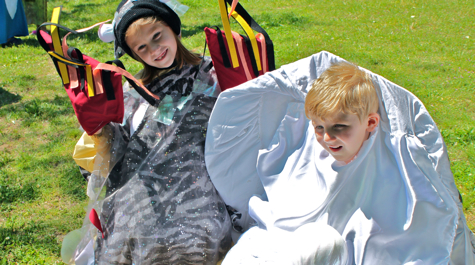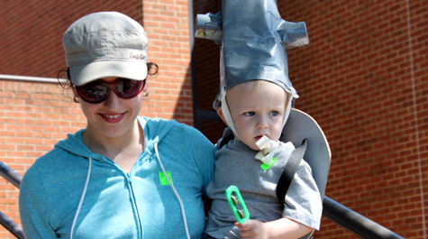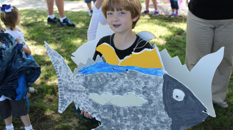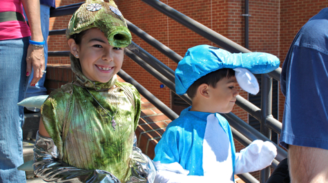 During the annual Parade of Marine Life, children and adults from around Tidewater walked through campus wearing handmade creature costumes including several seahorses, jellyfish, a hammerhead shark, a pearl-bearing oyster, a puffer fish, an auk, dolphins, and blue crabs.