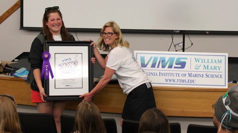 Artwork Winner VIMS Public Outreach Coordinator Susan Maples (R) presents Lauren Gregg of Gloucester (L) with a framed copy of the winning entry she submitted to VIMS' annual Marine Science Day logo contest. Lauren’s design decorated the back of every T-shirt, publication, and advertisement for the event. Photo by Erin Kelly.