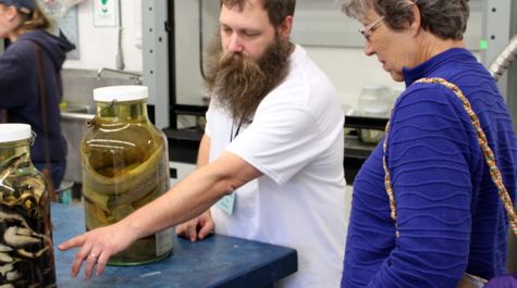 Fish Collection VIMS Assistant professor Eric Hilton shows a Marine Science Day visitor a sampling of the 128,000 specimens kept in the VIMS Ichthyology collection. Photo by David Malmquist.