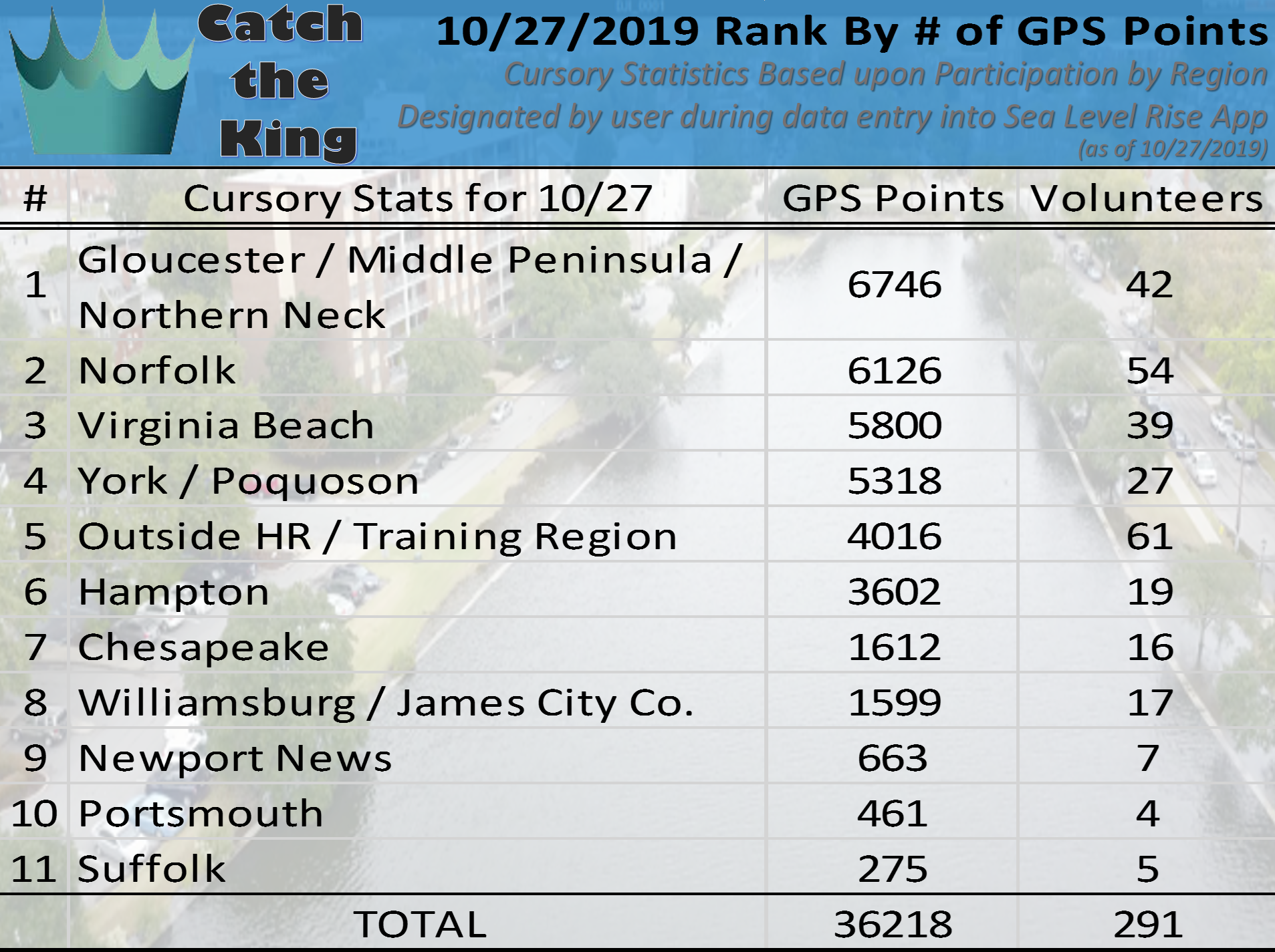 Catch the King 2023 had over 120 volunteers mapping inundation to collect over 13,500 GPS-reported high water marks via the free Sea Level Rise mobile application. Additionally, we collected even more tidal inundation data during the summer and fall (including September's "wet run" tides and rainfall event and Tropical Storm Ophelia) in more new places across VA's Coastal Plain that we've never mapped before. Thank you to Catch the King’s many tide mappers for their vigilance in helping us map 2023’s king tide in Virginia’s coastal communities!