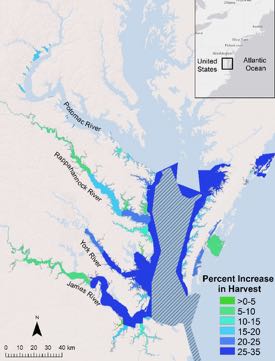 “We found that removing only 10% of the pots taken during the actual program, if those efforts were focused on the 10 most-fished sites, would have increased blue crab harvests by 8,144 metric tons, or about 60% of the benefit we saw from the full removal program,” says Scheld.