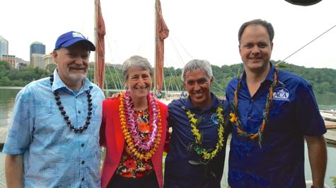 VIMS’ involvement in Hokule’a’s visit to Chesapeake Bay didn’t stop when the vessel left Yorktown on May 8th. After stops at Tangier Island, Piscataway Park on the Potomac, and Old Town Alexandria, the vessel docked at the Washington Canoe Club on May 18th, where Havens joined Nainoa Thompson and his fellow crewmembers to meet with U.S. Secretary of the Interior Sally Jewell, other members of the Obama administration, and several senators for further discussion of the environmental issues affecting Chesapeake Bay and the world’s oceans. Havens says that President Obama may make his National Oceans Month proclamation from the deck of the Hokuleʻa later this month.