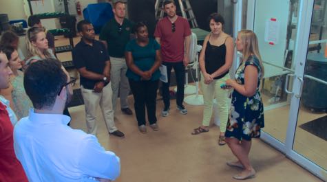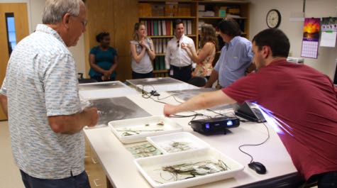 The staffers then braved the mid-day heat with a walking tour of the VIMS campus that included stops for background and updates on three representative research programs: NEAMAP, the Northeastern Monitoring and Assessment Program for coastal fisheries; the Seagrass Monitoring and Restoration program; and a laboratory study of the most effective vaccination schemes for rainbow trout in aquaculture settings.