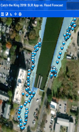 “Catch the King” participants gather their data using the free “Sea Level Rise” app developed by Stiles in conjunction with Concursive, a Norfolk-based software company. With phones in hand, these “king’s attendants” walk along the water line near peak tide, thumbing a “GPS pin” every few strides to mark the extent of tidal inundation.