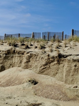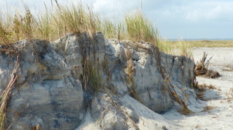 Natural dunes develop slowly as plants such as beach grass and sea oats trap windblown sand, then continue to grow upward from their roots with the rising dune. “A natural dune isn’t just a pile of sand,” says Hein. “It has an internal structure consisting of roots and fungi, which strengthen the dune and can reduce erosion from storms.”