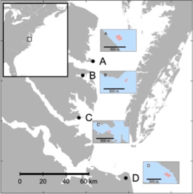 The researchers conducted the study during summer and fall of 2017, comparing turbidity, current speeds, and levels of dissolved oxygen and chlorophyll within and adjacent to oyster farms at four sites in the lower Chesapeake Bay: Windmill Point. Bland Point, Monday Creek, and Broad Bay. The farms differed in size, annual production, and use of either bottom-mounted or floating cages. The research team collected data both from the water and underlying sediments.