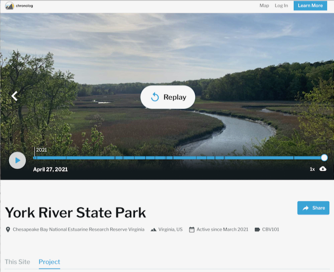 CBNERR-VA’s Taskinas Creek Chronolog—designated as CBV-101—joins similar units at 173 other sites across the U.S., as well as in Canada and the United Kingdom. To access time-lapse footage from the York River State Park Chronolog, visit https://www.chronolog.io and either click on the appropriate icon or filter by project "Chesapeake Bay National Estuarine Research Reserve Virginia."