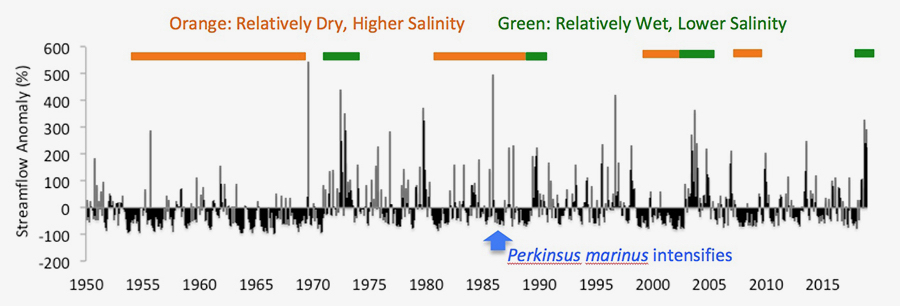Because the parasite’s infectiousness is known to increase with higher salinity, scientists initially attributed the mid-1980s spike in Dermo’s virulence to a multi-year drought that had struck the mid-Atlantic around that time, raising coastal salinities as freshwater input from rivers decreased. Increasing seawater temperatures also promote increased Dermo disease, and ocean warming has been blamed for the northward increase in Dermo’s range since the 1980s. As time passed, however, Carnegie and other researchers began to realize that salinity and temperature alone did not fully explain the lasting increase in Dermo infections and associated oyster mortality along the East Coast.