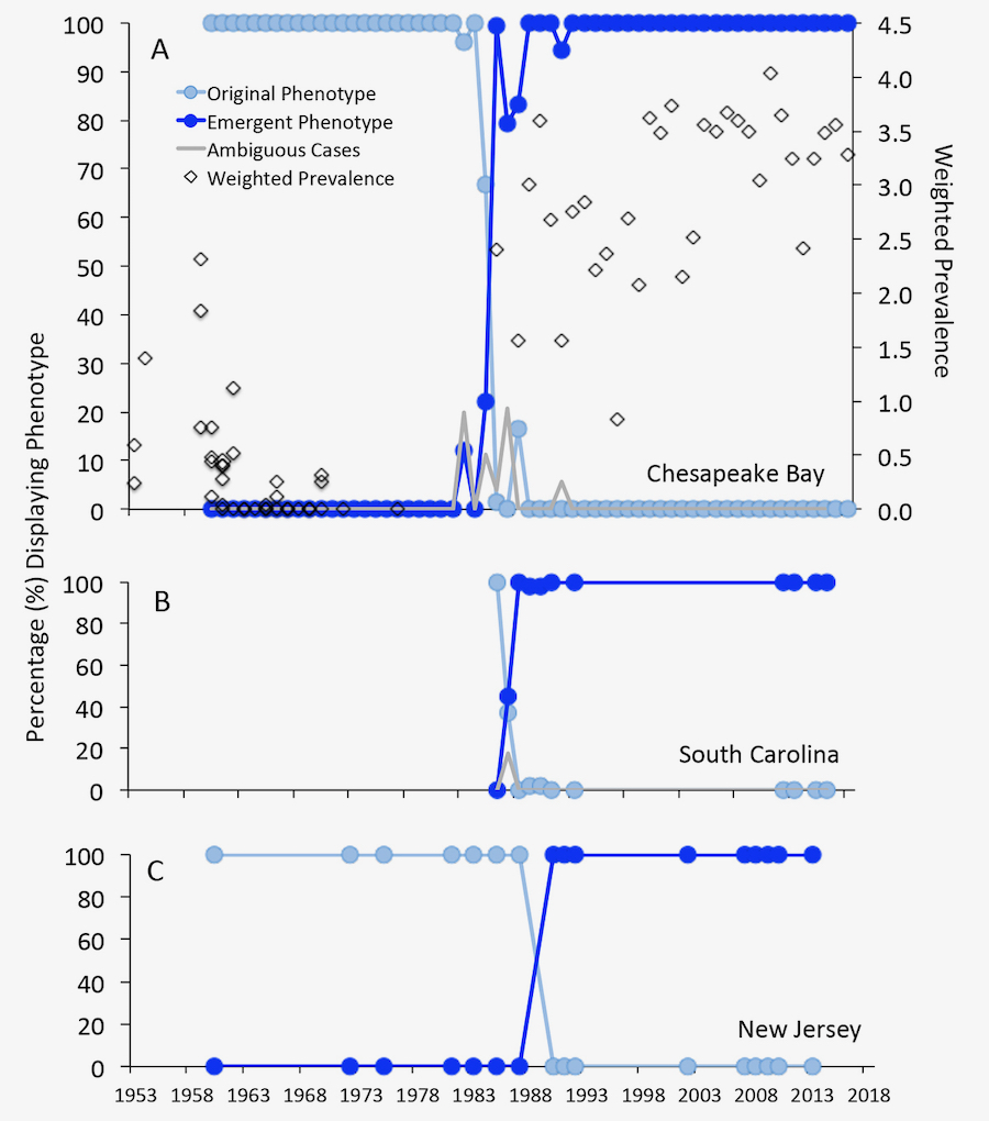 “The picture that emerges,” says Carnegie, “is the rise of a virulent new form of the Dermo parasite Perkinsus along the mid-Atlantic coast in the mid-80s, which dispersed from there and supplanted a form that previously had been widely distributed in Atlantic estuaries. While changes in pathogen virulence have been documented in other systems, the scope of changes we’ve seen, and their rapid spread across a wide area, is unusual.”