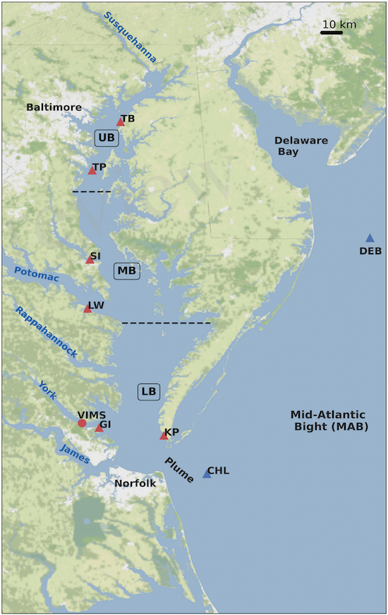 The authors warn this would have devastating impacts on the Bay ecosystem, aggravating the effects of nutrient pollution, increasing the severity of low-oxygen “dead-zones,” stimulating algal blooms, stressing or killing bottom-dwelling communities, causing shifts in species composition, and leading to declines in important commercial fishery species such as striped bass. Similar trends and impacts are likely in other shallow-water coastal systems worldwide given continued global warming.