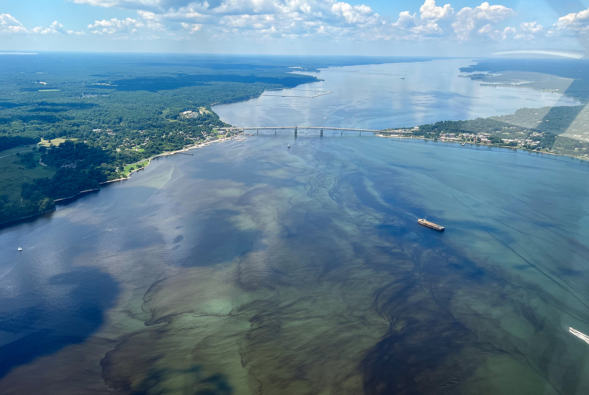 The winner of the Landscape category was Savannah Mapes, a 4th-year PhD student who studies harmful algal blooms (HABs) in the Aquatic Health Sciences department at VIMS. She took her aerial photo of the York River during an algal bloom of Margalefidinium polykrikoides, or "Marg." The dark swirls and streaks of dinoflagellates in the photo illuminate their fluid interactions with a barge, the Coleman Bridge, and the shores around Gloucester Point and Yorktown. VIMS monitors HABs in collaboration with the Virginia Department of Health using a variety of methods, including aerial photography via drone and plane. This photo was taken from a plane during a flight that was part of those monitoring efforts. HABs occur in the York River near-annually in late summer and can be associated with adverse impacts to aquatic animals and human health (though the human health impacts of Marg are not well-defined).