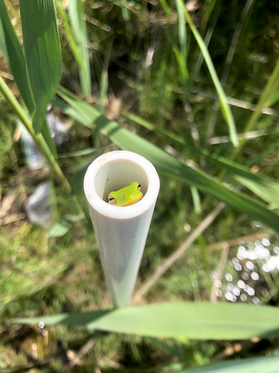 Grace Molino, a PhD student in the Coastal Geomorphology and Ecology lab at VIMS, won the Marine Wildlife category with her photo Saltmarsh Plot Visitor. Molino and colleagues were "surprised and delighted" to discover the little green tree frog (Hyla cinerea) inside a PVC pipe they use to mark the center of their saltmarsh plot at a field site in Blackwater, Maryland. “We were all very excited to find the frog,” says Molino, “and take a few minutes out of a hard field day to enjoy one of the creatures we don’t think much about in our work. He just made us all super happy and was definitely the highlight of our day!” The frog was discovered during an annual data-gathering endeavor that involves long days in the field for a large team in order to collect an abundance of data from 100 plots and is meant to try to answer questions related to rising sea levels, such as “what is finally killing the mature trees: salinity, inundation, or removal of the canopy by storms?” and “why does this area have lots of Phragmites, but others don’t?” The researchers visit the plots each year to monitor and try to understand how the landscape is transitioning from coastal forest to marsh as sea level rises. The plots are located at 5 permanent field sites from Virginia to Delaware that represent a diversity of slopes, salinities, and marsh types.