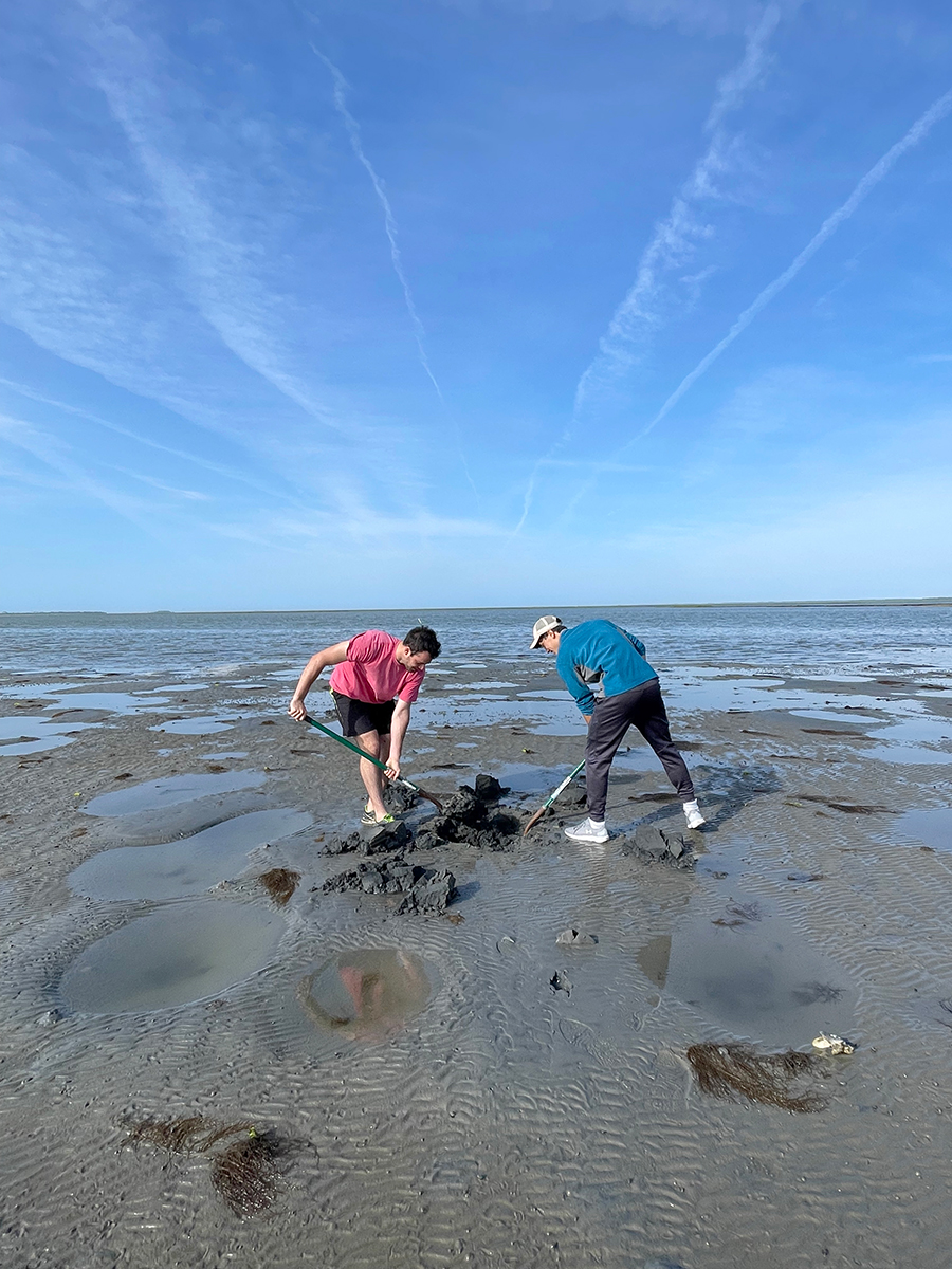 In the People at Work category, research scientist and Coastal Hydrodynamics & Sediment Dynamics (CHSD) program director Grace Massey took the top prize for her photo of undergrad Jonathan Moore and REU intern James Lu digging for benthic invertebrates in the mudflats of Cedar Island, Virginia. The ripples in the mud and contrails in the sky draw the eye into the hard work of students looking for invertebrates in mud to be identified later at the Eastern Shore Laboratory (ESL). On this outing, Lu and Moore dug up hard clams (Mercenaria mercenaria) and plume worms (Diopatra cuprea). Each summer the Research Experiences for Undergraduates (REU) program, directed by Rochelle Seitz and coordinated by Massey, takes a field trip to the ESL. Moore joined the field trip as a visiting undergraduate student from Virginia Tech working in the CHSD lab on a collaborative project between VIMS, VA Tech, and the Dauphin Island Sea Lab.