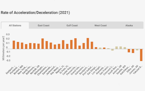 Previous work by Boon, Mitchell, and VIMS colleague Derek Loftis suggests the current acceleration in rates of sea-level rise began around 2013 or 2014, likely associated with ocean dynamics and ice-sheet loss. In 2020, rates of sea-level rise accelerated at all 21 of the report-card stations along the U.S. East and Gulf coasts, and at 7 of the 8 monitored stations along the U.S. West Coast excluding Alaska. All four stations monitored in Alaska show relative sea level falling at increasingly rapid rates. This is due to various processes causing rapid uplift of the coast, tide gauges rising along with the land they rest on.