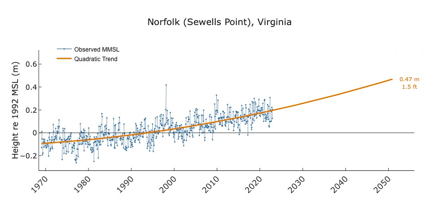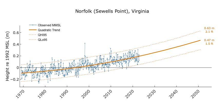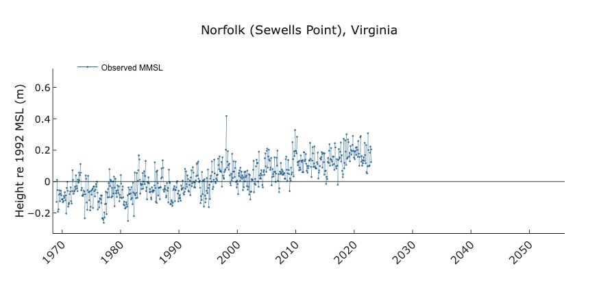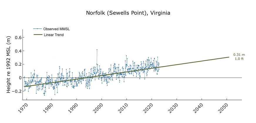 Want to know how sea level in your area is changing due to global warming and other factors? Sea level “report cards” from William & Mary’s Virginia Institute of Marine Science forecast sea level to the year 2050 based on an annual analysis of tide-gauge records for 32 localities along the U.S. coast. The analysis now includes 54 years of water-level observations, from 1969 through 2022. Scroll down to discover this year's highlights and learn why our report cards provide maximum value to coastal residents, businesses, and governments. Then visit our interactive charts, which are available online at www.vims.edu/sealevelreportcards.