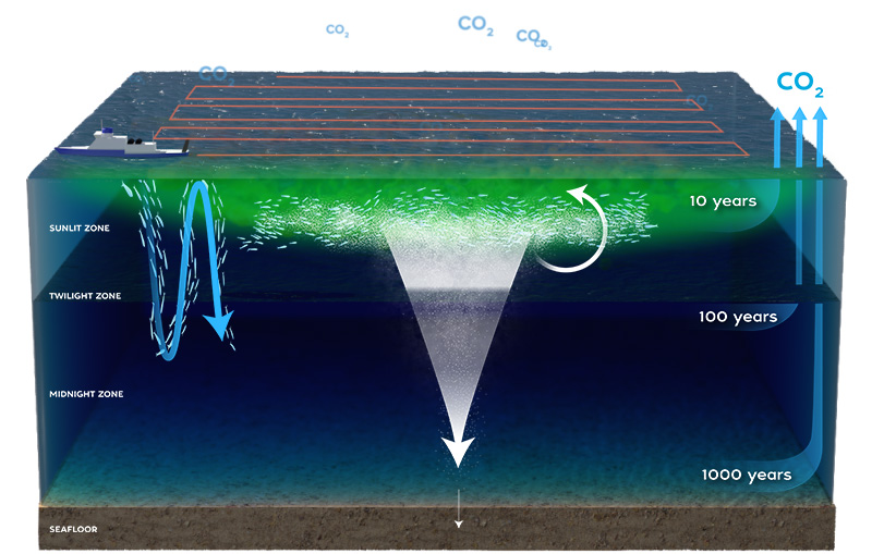 OIF is a technique to add tiny amounts of the micronutrient, iron, to the ocean’s surface to promote the growth of marine plants, or phytoplankton. This growth removes CO2 from the atmosphere, and as plankton die or are eaten, transfers some of that carbon as sinking particles for storage in the deep ocean. While large amounts of iron naturally enter the ocean, OIF is an effort to speed up that process.