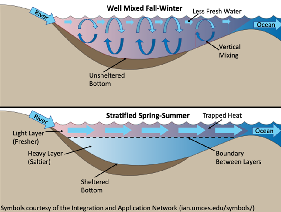 The stratification (density contrast) of the water column inherent to spring and summer in the Chesapeake Bay serves to insulate the bottom from extreme conditions, perhaps protecting organisms from exceeding their temperature tolerances. Weak stratification in the fall and winter, conversely, allows the heat to penetrate all the way to the bottom during marine heatwaves.