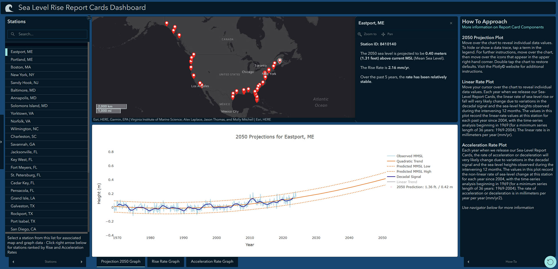 This year, the report cards are consolidated in an interactive dashboard and add data from tide gauge stations in Annapolis, MD; Solomons Island, MD; Yorktown, VA; and Fort Myers, FL.