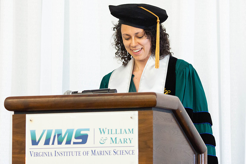 “We came to the Batten School & VIMS because we wanted to make an impact beyond a citation count. VIMS’ graduate students are committed to making our school, our coastline and our fields better places,” said Grace Molino, who graduated with her Ph.D. after making significant contributions to understanding the conversion of coastal forests to marshland in response to sea level rise. “The collective work of our graduates spans the entire Atlantic Coast to the Gulf Coast, Pacific Coast, Alaska and internationally. It is abundantly clear from conversations with any of the students in this room that the work we do is not only necessary but extremely important.”