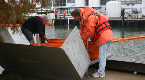 VIMS vessels, captained by Jim Goins and Voight Hogge, supported additional exercise efforts at Gloucester Point. Crewmembers, including a HAZMAT team from the Newport News Fire Department, deployed a containment boom near VIMS' new concrete pier, which holds the intake lines for the Institute's Seawater Research Laboratory. The crew also deployed a boom near the pumps that supply water to the Institute's Oyster Hatchery.