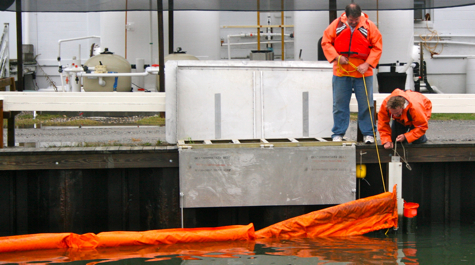 Vessels Operation director George Pongonis says the boom system at VIMS is unusual in that its two separate components operate like a lock, allowing vessels to enter or exit while at the same time keeping oil in or out. The design is important, he says, "because it would allow us to deploy vessels to help manage a spill on the river, while preventing any of the spilled oil from entering and contaminating our own harbor."