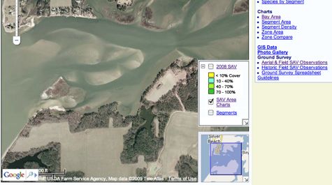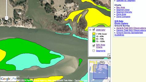 “As you zoom in, the map switches from an overall Bay chart, to zone charts, and finally to individual segment charts,” says Orth. “Zoom in even further, and the green areas denoting SAV coverage resolve into different colors that denote the density of underwater grasses in each bed.” These density data, painstakingly interpreted from aerial photography by program scientists, tell the user whether the grass coverage in a particular bed is sparse, moderately thick, or very thick.