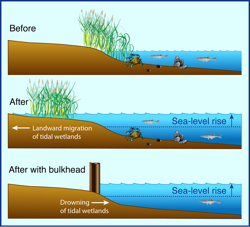 Says Hershner, "In the face of rising sea level, construction of bulkheads doesn't just affect the habitat beneath the bulkhead's footprint—it also impacts the land behind the bulkhead where tidal wetlands would otherwise migrate."