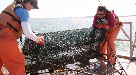 The Bay-wide blue crab winter dredge survey is a cooperative effort between DNR and VIMS, and is the primary survey used to assess the condition of the Chesapeake Bay blue crab population. Since 1990, the survey has employed crab dredges to sample blue crabs at 1,500 sites throughout the Chesapeake Bay from November through March. By sampling during winter when blue crabs are buried in the mud and stationary, scientists can develop, with good precision, estimates of the number of crabs present in the Bay.