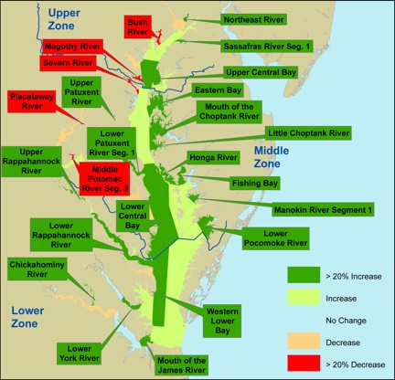 VIMS professor Bob Orth, leader of the SAV baywide annual survey, says "The overall increase in SAV acreage in 2009 was strongly driven by changes in the middle and lower Bay zones, including Tangier Sound, the lower central and eastern lower Chesapeake Bay, Mobjack Bay and the Honga, Rappahannock, and lower Pocomoke rivers."