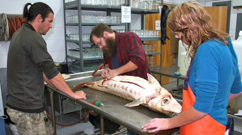 The dissected sturgeon was captured last spring in a gillnet in the James River, where fisheries scientists from VIMS and Virginia Commonwealth University are working with commercial anglers and the Army Corps of Engineers to reduce by-catch and restore the sturgeon population.