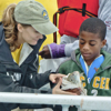 Marine recreation specialist Susanna Musick helps youngsters tag fish during annual youth-focused fishing event.