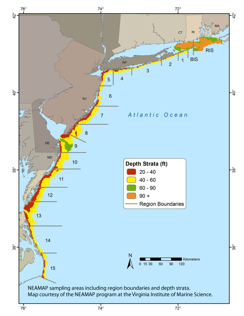 The VIMS component of NEAMAP—the Mid-Atlantic/Southern New England Near Shore Trawl Survey—currently supplements and extends the federal survey, with responsibility for sampling all waters shallower than 60 feet between Cape Hatteras and Cape Cod—an area of roughly 4,500 square miles.